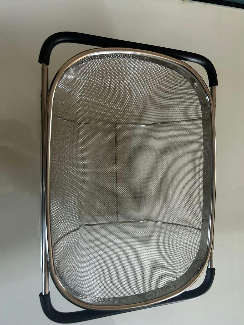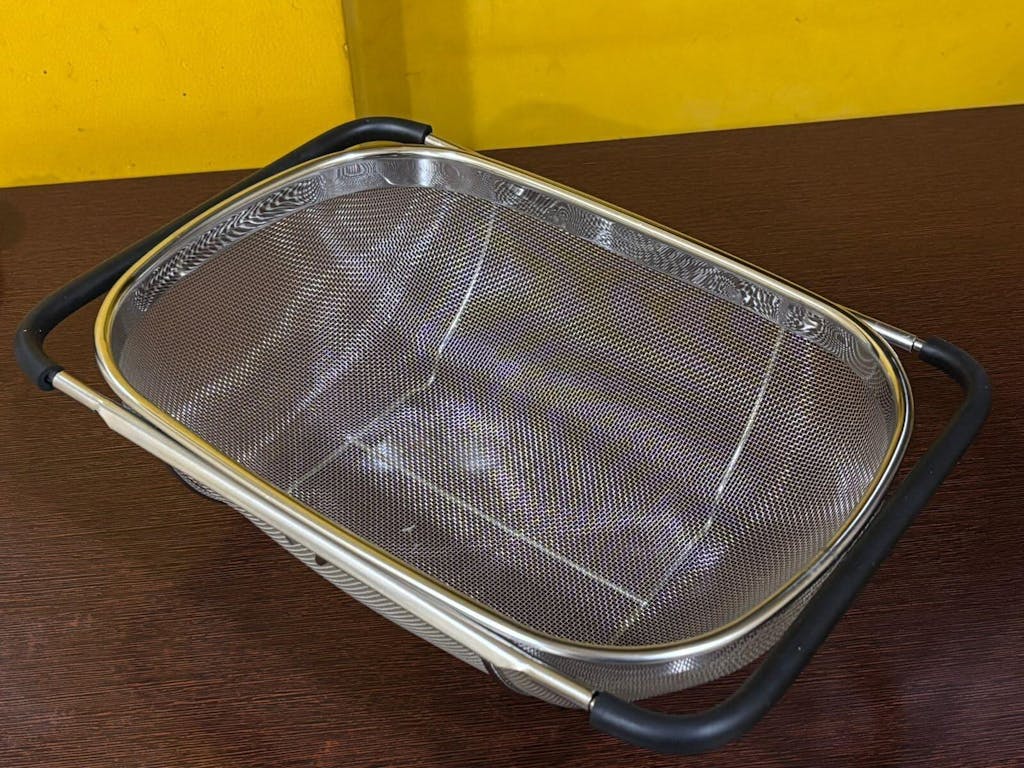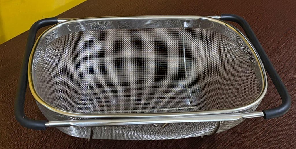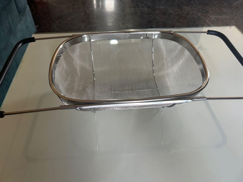 This over-the-sink colander is perfect for rinsing rice, fruits, and vegetables without anything slipping through. The stainless steel build feels premium, rust-proof, and very sturdy. The expandable rubber grip handles fit perfectly over the sink and stay in place while draining. It’s super convenient, easy to clean, and saves counter space.